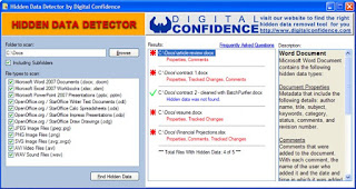 Después de que se ejecuta la exploración entonces avisa si las propiedades del documento, seguido cambios, comentarios, notas de presentación, u otros tipos de datos y metadatos ocultos están presentes en sus archivos que le permite la seguridad para evaluar el riesgo de compartir archivos que contienen potencialmente confidencial y datos privados ocultos, y evaluar su necesidad de una solución integral de eliminación de datos oculta.